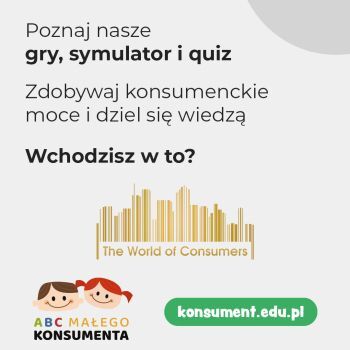 Uczniów klas 7 i 8 zachęcam do gry „The World of Consumers”. Wcielając się w postać np. gamera, skate’a czy aktywistki ekologicznej, nastoletni gracze przemierzają ulice miasta, zaglądają do sklepów, internetu czy wyruszają w podróż – sprawdzając przy tym swoją wiedzę z prawa konsumenckiego.