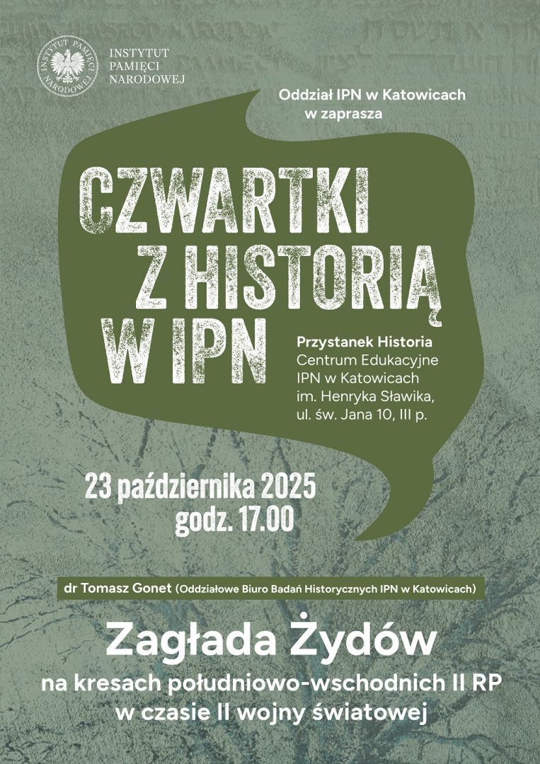 o godz. 17.00. Tym razem naszym gościem będzie dr Tomasz Gonet z Oddziałowego Biura Badań Historycznych IPN w Katowicach, który wygłosi wykład „Zagłada Żydów na kresach południowo-wschodnich II RP w czasie II wojny światowej”.