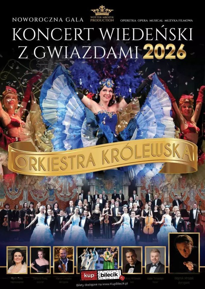 Wracamy i zapraszamy Państwa w podróż do roztańczonego, magicznego Wiednia oraz energetycznego Nowego Jorku, gdzie będą rozbrzmiewać najpiękniejsze arie, duety, walce i polki Johanna Straussa, Franca Lehara, Imre Kalmana a także największe szlagiery musicalowe, filmowe i światowe przeboje wszech czasów. Tegoroczny koncert w wykonaniu światowej. W programie udział wezmą międzynarodowi artyści - znani polskiej i międzynarodowej publiczności a wśród Agata Sava mezzosopran - solistka opery w Pradze, która koncertuje aktywnie na scenach całego świata takich jak: Chicago Philharmonic Hall, Filharmonia Narodowa w Warszawie, Lucerne Concert Hall i wiele innych. Jest absolwentką Hohschule fur Musik w Monachium. Barbara Gutaj sopran, solistka Teatru Wielkiego w Poznaniu, wyróżniona prestiżową Teatralną Nagrodą Muzyczną im. Jana Kiepury w kategorii "Najlepszy Debiut" za debiut na deskach Mazowieckiego Teatru Muzycznego. Debiut w Teatrze Wielkim Poznaniu miał miejsce podczas premiery "Fausta" A. Radziwiłła w reżyserii Adama Hanuszkiewicza, gdzie jej rolę Małgorzaty Józef Kański w "Ruchu muzycznym" określił jako "operowe odkrycie sezonu". Nazar Tatsyshyn - tenor niezaprzeczalnym numerem jeden wśród tenorów młodego pokolenia. Solista obdarzony pięknym głosem śpiewającym w najlepszej tradycji włoskiego Bel Canta jest solistą Opery Narodowej w Budapeszcie. Andrzej Witlewski aktor, wokalista - bas od lat współpracuje z wieloma instytucjami kultury polskiej. Koncert uświetni swoim udziałem niezwykły wirtuoz skrzypiec Marjan Lomaha, który ostatnie 3 lata spędził w Japonii koncertując w każdej sali koncertowej tego kraju. Lomaha koncertował również m.in.: w Filharmonii Berlińskiej, Concertgebow w Amsterdamie, w lipskim Gewandhaus. W tym roku wystąpi w Polsce. W jego wykonaniu usłyszymy wirtuozowskie parafrazy ze Skrzypka na dachu, Czardasza Montiego, utwory z repertuaru Roby Lakatosa. Całość koncertu poprowadzi znany światowej publiczności dyrygent i wirtuoz klarnetu Maestro Woytek Mrozek, który aktywnie koncertuje na całym świecie. "..Mrozek należy do grona poszukiwanych na świecie artystów..." napisała Süddeutsche Zeitung w Monachium. Artysta słynie z niekonwencjonalnych pomysłów i nieposkromionej wyobraźni. Artyści przeniosą słuchaczy do ojczyzny walca prezentując niezwykły kunszt wokalny i instrumentalny. Ta niezwykła gala będzie wzbogacona wirtuozerskim tańcem par tanecznych, barwnymi kreacjami i bogatą choreografią, co pozwoli na doświadczenie wielu doznań artystycznych w iście książęcym stylu. Pary taneczne to soliści Narodowego Teatru Opery i Baletu we Lwowie. W ten magiczny wieczór zabrzmią największe przeboje Króla walca Johanna Straussa takie jak uwertura z Zemsty Nietoperza, Keiser Marsz, Marsz Radezki, walc "Nad pięknym modrym Dunajem", "Odgłosy wiosny" a także polki Trich Trasch, Eljen Magiar Polka, Anne Polka, Gromy i Błyskawice i wiele innych orkiestrowych szlagierów. Nie zabraknie także popisowych arii i duetów z najsłynniejszych operetek: Zemsty Nietoperza, Barona Cygańskiego, Księżniczki Czardasza, Hrabiny Maricy, Wesołej Wdówki czy Krainy Uśmiechu. Publiczność wysłucha między innymi: arie "Adeli", "Czardasz Sylvi", kuplety Barinkaya "Wielka sława to żart", "Graj Cyganie", " Artystki z Variete", "Brunetki Blondynki" a także duety wszechczasów, m.in. "Usta milczą dusza śpiewa", "Jakże mam Ci wytłumaczyć", " Jedź do Verasdin", " Co się dzieje oszaleję", "W rytm walczyka", "Tłumy Franków" z Księżniczki Czardasza. Nie zabraknie także sztandarowych pieśni neapolitańskich takich jak: "Funikuli-Funikula", "O Surdato N"namurato". W drugiej części koncertu artyści zaprezentują się w repertuarze musicalowym, filmowym i światowych przebojów m.in.: "Za Tobą pójdę jak na bal" - K. Krawczyka, "Wielka Miłość" - S. Krajewskiego, "Delilah" - T. Jonsa, "Nella Fantasia" z filmu Misja, "New York-New York" - F. Sinatry, "Volare", "O sole mio" - w wersji E. Presleya, "Przetańczyć całą noc" z musicalu My Fair Lady, "Gdybym był bogaczem" z musicalu Skrzypek na dachu i wiele innych noworocznych, muzycznych niespodzianek.