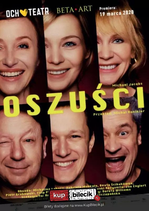 bilety: Trzy związki: dwa małżeństwa i młodzi kochankowie stojący przed decyzją - ślub czy rozstanie? "Oszuści" to wspaniała komedia zbudowana na sieci małych i dużych kłamstw. Michelle i Allen są ze sobą już dwa lata. Oboje mają wątpliwości, czy spędzić ze sobą resztę życia. Zwracają się po radę do swoich rodziców. Czy mogą spodziewać się szczerej odpowiedzi? W ramach zacieśniania więzi organizują kolację, podczas której wszyscy mają się lepiej poznać. Ten wieczór wywróci ich życie (lub życie trzech par) do góry nogami. W spektaklu "Oszuści" z dużą lekkością stawiane są trudne pytania - o kondycję współczesnej rodziny i małżeńską nudę. Obsada: Michalina Łabacz Gabriela Muskała Beata Ścibakówna Piotr Grabowski Filip Pławiak Zbigniew Zamachowski Produkcja: Och-Teatr Reżyseria: Jan Englert Przekład: Michał Ronikier Scenografia: Arkadiusz Kośmider Kostiumy: Dorota Williams Opracowanie muzyczne: Agnieszka Szczepańska Bilety do nabycia na: KupBilecik.plOszuści artyści: Michalina Łabacz, Gabriela Muskała, Beata Ścibakówna, Piotr Grabowski, Filip Pławiak i inniTrzy związki: dwa małżeństwa i młodzi kochankowie stojący przed decyzją: ślub czy rozstanie? "Oszuści" to wspaniała komedia zbudowana na sieci małych i dużych kłamstw. Michelle i Allen są ze sobą już dwa lata. Oboje mają wątpliwości, czy spędzić ze sobą resztę życia. Zwracają się po radę do swoich rodziców. Czy mogą spodziewać się szczerej odpowiedzi? W ramach zacieśniania więzi organizują kolację, podczas której wszyscy mają się lepiej poznać. Ten wieczór wywróci ich życie (lub życie trzech par) do góry nogami. W spektaklu "Oszuści" z dużą lekkością stawiane są trudne pytania - o kondycję współczesnej rodziny i małżeńską nudę. Bilety do nabycia na: KupBilecik.pl |