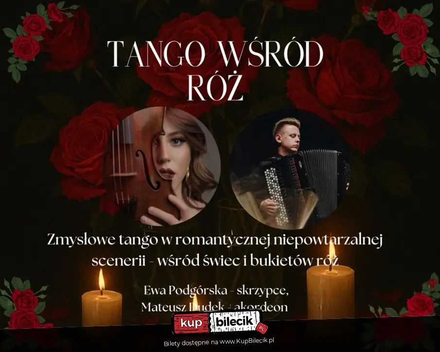 bilety: "Tango wśród róż" to nastrojowy, kameralny koncert w formie recitalu na skrzypce i akordeon, osadzony w wyjątkowej scenografii - wśród świec i bukietów róż. Tango w swojej naturze jest muzyką niezwykle emocjonalną - łączy tęsknotę z namiętnością, melancholię z dramatem i porywającą energią. Duet skrzypiec i akordeonu tworzy wyjątkowe, głębokie połączenie brzmieniowe, które jeszcze mocniej podkreśla intensywność i charakter tej muzyki. To nie jest zwykły koncert - to zmysłowe, muzyczne doświadczenie. Ewa Podgórska - skrzypce Tango wśród bukietów róż artyści: Ewa Podgórska, Mateusz Dudek"Tango wśród róż" to nastrojowy, kameralny koncert w formie recitalu na skrzypce i akordeon, osadzony w wyjątkowej scenografii - wśród świec i bukietów róż. Tango w swojej naturze jest muzyką niezwykle emocjonalną - łączy tęsknotę z namiętnością, melancholię z dramatem i porywającą energią. Duet skrzypiec i akordeonu tworzy wyjątkowe, głębokie połączenie brzmieniowe, które jeszcze mocniej podkreśla intensywność i charakter tej muzyki. To nie jest zwykły koncert - to zmysłowe, muzyczne doświadczenie. Bilety do nabycia na: KupBilecik.pl |